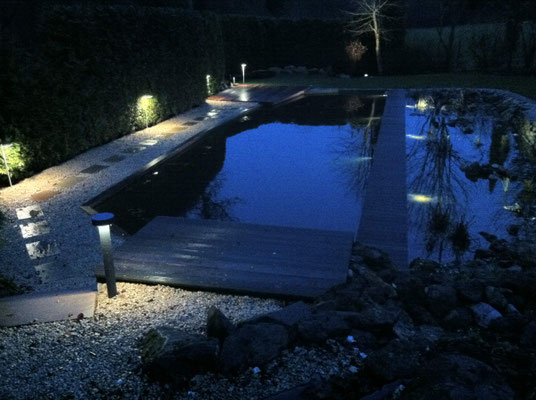 Der neu gestaltete Naturteich mit Quellzulauf wird von einem illuminierten Steg in die Bereiche Schwimmen und Klären geteilt. Ergänzend hierzu wird die Zuwegung zur Sauna und zum Liegebereich, sowie die umliegende Bepflanzung sanft illuminiert.
